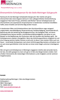 Wer sich gerne als Schiedsperson in Meiningen engagieren möchte oder jemanden kennt, der bzw. die dafür geeignet ist, kann sich gerne im Büro des Bürgermeisters melden. Dort erhalten Interessierte alle notwendigen Informationen zu den Aufgaben und der weiteren Vorgehensweise.