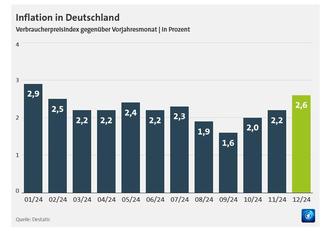 Der Anstieg der Teuerung im vergangenen Dezember ist der dritte in Folge. Im Oktober war die jährliche Inflationsrate nach zwei Monaten mit sinkenden Werten auf 2,0 Prozent gestiegen. Der November hatte mit 2,2 Prozent dann erstmals seit Juli 2024 wieder einen Wert über der Zwei-Prozent-Marke gebracht. Dennoch ist die Teuerung in Deutschland weit entfernt vom Höchststand im Herbst 2022 mit seinerzeit 8,8 Prozent.