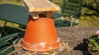 Mit nur wenigen Utensilien lässt sich ein Hummelhaus jedoch auch schnell selbst bauen. Die einfachste Variante ist die Verwendung eines großen Terrakotta-Blumentopfes. Diesen umgedreht auf gehäckseltes Holz stellen und mit unbehandeltem Moos befüllen. Damit kein Wasser in das selbst gebaute Hummelhotel eindringen kann, einfach ein kleines Dach aus zwei kurzen Latten und einem Brett zusammenschrauben und auf den Topf setzen.