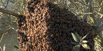 In der Esskastanie auf dem Bild haben sich mindestens 10 Bienenschwärme niedergelassen, so als hätten sie sich untereinander abgesprochen haben diese Völker den gleichen Tag zum Schwärmen genutzt. Jeder, der schon einmal einen Bienenschwarm gesehen hat weiß, welche Faszination von ihm ausgeht. Man möchte ihn beobachten aber bleibt natürlich auf Distanz, weil Bienen ja immerhin stechen können.