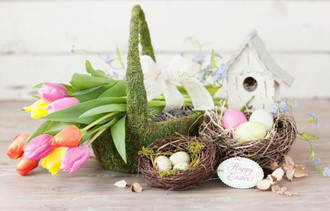 - Aus Weidenruten, geschmückt mit Bändern, Eiern, Federn & Frühlingsblumen