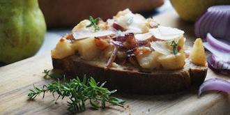 4 reife Birnen, 4 Scheiben Bacon, 2 TL Butter, 1 TL Zucker, 1 rote Zwiebel, Salz, Pfeffer, 2 große Scheiben Krustenbrot ca. 1 cm dick, 3 TL Frischkäse, 1 kleiner TL eingelegter grüner Pfeffer, 2 Zweige Thymian, 1 Handvoll würzige Käsewürfel, etwas Parmesan