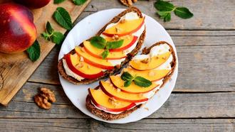 | 2. | Die Vollkornbrotscheiben zum gewünschten Härtegrad toasten. Währenddessen die Nektarine abbrausen, entkernen und in Scheiben schneiden. Das Brot mit dem Ziegenfrischkäse bestreichen und die Obstscheiben darauf legen. Die Walnüsse mit dem Messer grob hacken und daraufstreuen. Mit etwas Meersalz bestreuen und der Minze. Wer mag, kann noch ein paar Tropfen Honig draufträufeln. Fertig! |