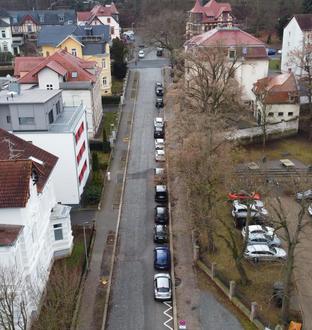Parallel dazu erfolgt durch die Stadt der grundhafte Ausbau der Fahrbahn und der Gehwege. Insgesamt werden rund 2.100 Quadratmeter Oberfläche aufgenommen. Geplant sind unter anderem das Setzen von etwa 600 Metern Bordsteinen, die Herstellung von rund 350 Quadratmetern Betonpflaster, etwa 700 Quadratmetern Natursteinpflaster sowie rund 1.050 Quadratmetern Asphaltbefestigung.
