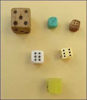 Würfel aus Holz, Knete, Brot, Kieselstein, Pferdeknochen, Wachs