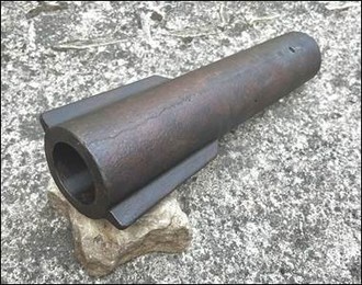 Die Abbildung zeigt einen Katzenkopfes aus einer Wagenradachse. Oben rechts ist das Zündloch zu erkennen.