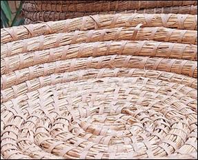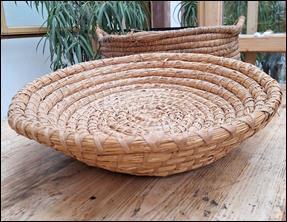 Die Abbildung zeigt eine kleine Wanne zum Getreidereinigen aus Strohseilen, Durchmesser: 50 Zentimeter