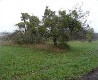 Das abgebildete Foto zeigt von Misteln befallene Obstbäume in jüngster Zeit. Derart befallene Bäume sind nicht mehr zu retten. Als Ruinen bleiben sie bisweilen noch einige Jahre stehen, bevor sie samt ihrem gefaulten Stamm umfallen.