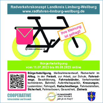 Zur Stärkung des Radverkehrs entsteht im Landkreis Limburg-Weilburg bis Ende des Jahres 2023 ein Konzept für ein durchgängiges, kreisweites Radverkehrsnetz, welches die Städte und Gemeinden auf sicheren Wegen miteinander verbinden und ein Gerüst für den kommunalen Radverkehr bilden soll.