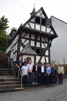 Landrat Michael Köberle und Bürgermeister Peter Blum (6.u.7.v.l.) mit Vertretern des Vereinsvorstandes vor der sanierten alten Burgschmiede.
