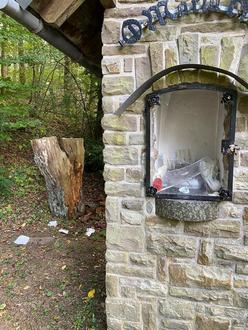 Am 19.09.2024 wurde der Bildstock „O Maria-Hilf“ am Sportplatzweg in Ellar mutwillig stark beschädigt. Es wurde die Scheibe mit einem großen Stein eingeworfen. Dabei gingen neben der Scheibe, die Madonna und ein Blumengesteck in die Brüche. Eine ukrainische Fahne wurde aus dem Innenraum entwendet. Diese wurde ein paar Meter weiter entfernt zerstört aufgefunden. Seitdem Josef Zey im Jahre 1980 den Bildstock gebaut hatte, kam es leider immer wieder zu Zwischenfällen. So wurden Pflanzen zerstört und entwendet, die liebevoll gepflanzt und gepflegt wurden. Vor einigen Jahren wurde die Scheibe aufgebrochen und eine Madonna entwendet.