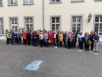 Landrat Michael Köberle (Achter von links) übergab in der Kreis- und Stadtbücherei Weilburg Förderbescheide an Vertreterinnen und Vertreter von 32 Büchereien. Elfter von links der Weilburger Bürgermeister Dr. Johannes Hanisch.