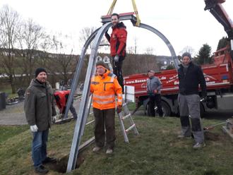 Dank der freiwilligen Helfer und Mitglieder des Ortsbeirates Hintermeilingen, sowie der Firma Schlosserei Rudersdorf GmbH & Co. KG und Firma Beese & Bausch Massivhaus GmbH, welche einen LKW-Kran zur Verfügung stellte. So konnte der Glockenturm schnell seinen gewünschten Platz auf dem Friedhof in Hintermeilingen finden. Als nächstes erfolgt der Einbau der Glocke.