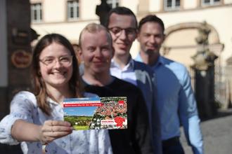 Die Vorstandsmitglieder Julia Rausch und Frederik Frimmel sowie Kreisvorsitzender Patrick Krug und der Landtagsabgeordnete Maximilian Ziegler präsentieren die Postkarte (v.l.n.r.)