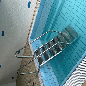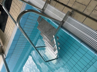 Am Donnerstag, den 22.05.2025 war es endlich so weit, die in Auftrag gegebene Edelstahltreppe mit beiderseitigem Handlauf wurde ins Schwimmbad geliefert und umgehend vom Bauhofpersonal in der Wärmehalle installiert.
