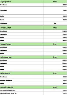 Zunächst wurden die Eintrittspreise durch Beschluss der Gemeindevertretung moderat angehoben. Die neuen Tarife stellen sich wie folgt dar:
