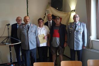 Oberstabsfeldwebel d. R. Achim Höll, Vorsitzender der Kreisgruppe Oberhessen, dankte der RK für ihre Arbeit und zeichnete den Hauptgefreiten d. R. Günter Janich mit der silbernen Ehrennadel der Kreisgruppe aus. Bronze bekamen Obergefreiter d. R. Holger Schwallack und Hauptgefreiter d. R. Gerhard Bünz. Vorsitzender Janich ehrte den Obergefeiten d. R. Horst Adolph für 40 Jahre Mitgliedschaft im Reservistenverband und ernannte Oberfeldwebel d. R. Bernd Vogel und Hauptgefreiten d. R. Gerhard Bünz zu Ehrenmitgliedern.