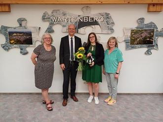 In der letzten Sitzung der Gemeindevertretung nahm Bürgermeister Dr. Olaf Dahlmann die Gelegenheit war, um der bisherigen Auszubildenden der Gemeinde Wartenberg, Frau Leonie Henkel, im Namen des Gemeindevorstandes und der gemeindlichen Gremien zur bestandenen Abschlussprüfung zur Verwaltungsfachangestellten zu gratulieren. Frau Henkel wurde vorerst in ein befristetes Beschäftigungsverhältnis übernommen und unterstützt die Kollegen des Rathauses weiterhin. Am 01.09.2023 beginnt Frau Henkel bei der Stadt Frankfurt das duale Studium „Bachelor of Arts - Public Administration“ und bleibt dem öffentlichen Dienst weiterhin als Inspektorenanwärterin erhalten. Herr Dahlmann überreichte ein kleines Geschenk und wünschte Frau Henkel für den weiteren Lebensweg alles Gute.