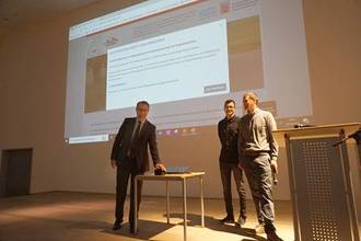 Geben gemeinsam das Startsignal für das Beteiligungsportal: Erster Kreisbeigeordneter Dr. Jens Mischak (links), Geschäftsführer Paul Fremer (rechts) vom Planungsbüro RV-K und Mitarbeiter Erik Drawe. (Foto: Vogelsbergkreis/C.Lips)