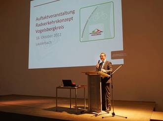 Erster Kreisbeigeordneter Dr. Jens Mischak erläutert das Radverkehrskonzept Vogelsbergkreis, das gemeinsam mit dem Planungsbüro RV-K und den Menschen im Vogelsbergkreis erarbeitet werden soll (Foto: Vogelsbergkreis/C.Lips)