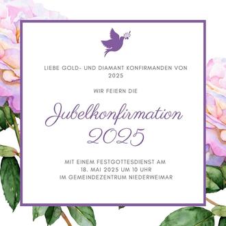Zum Vormerken: am 18. Mai 2025 findet in Niederweimar die Jubelkonfirmation für die Gold und Diamantkonfirmanden statt. Da viele ehemalige Konfirmandinnen und Konfirmanden nicht mehr in der Kirchengemeinde wohnen, haben wir leider keinen Zugriff auf alle Kontaktdaten. Falls Sie noch Kontakt zu auswärtigen Mitkonfirmand*innen haben, können Sie uns helfen, indem Sie diese über die Jubelkonfirmation informieren, und Sie bitten sich bei uns anzumelden. Auch wenn Sie selbst keine Einladung erhalten haben, sind Sie natürlich von Herzen eingeladen und können sich direkt anmelden. Anmeldung direkt an unsere Gemeindesekretärin per Mail martina.kratzer@ekkw.de oder telefonisch 01575-4343203 (gerne eine Nachricht hinterlassen).