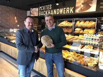 Herr Bürgermeister Markus Herrmann begrüßte den Geschäftsführer der Mühlenbäckerei Pfeiffer, Herrn Schautes, bei der Filialeröffnung in Niederweimar.
