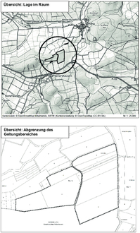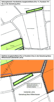 (2) Der Geltungsbereich des Bebauungsplanes und der FNP-Änderung ist den nachfolgenden Übersichtskarten zu entnehmen und umfasst die Flurstücke 41/1, 43, 44, 45, 50, 51, 52/1, 69, 103 und 121/46 in der Flur 15, jeweils Gemarkung Allna. Die externen Ausgleichsflächen liegen in der Flur 11, Flurstück 77/1tlw. in der Gemarkung Allna und in der Gemeinde Lohra, Gemarkung Nanz-Willershausen in der Flur 4, Flurstück 2tlw.