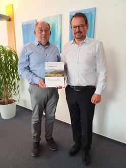 Werner Trippel stellte Bürgermeister Herrmann sein Dorfbuch von Wolfshausen an der Lahn vor. Der passionierte Hobby-Historiker Werner Trippel beschäftigte sich in den letzten Jahren intensiv mit der Historie der Nehebrücke über die Lahn, welche das „Eingangstor“ von Marburg war. „In meiner freien Rentnerzeit eignete ich mir das Lesen alter Schriften an und konnte viele Bände von Originalakten studieren.“, berichtete Herr Trippel im Gespräch. „Ich stellte mir auch die Frage, was war davor, bevor es eine zentrale Brücke gab?“ führte der Autor weiter aus.