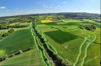Die Fotomontage zeigt die geplanten Maßnahmen im Bereich Schenkenwäldchen mit dem alten Lahnverlauf, der zeitweise Wasser führen wird. Fotomontage: Gemeinde Fronhausen