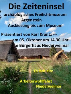 | Thema: | „Die Zeiteninsel“ - Das archäologisches Freilichtmuseum Marburger Land ist ein Museumsprojekt im Aufbau am Rande von Weimar-Argenstein. Zukünftig werden fünf Zeitstationen und das „Insel-Zentrum“ elf Jahrtausende Landschafts- und Kulturgeschichte lebendig werden lassen. Karl Krantz schildert in seinem Vortrag das „Wachsen“ des Museums - von den ersten Ausgrabungen bis heute. |