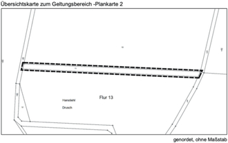 | In der nachfolgenden Übersichtskarte 2 ist die Lage der externen Ausgleichsflächen für den artenschutzrechtlichen Ausgleich ersichtlich. Die artenschutzrechtlichen Ausgleichsflächen umfassen in der Flur 13 das Flurstück 11tlw. sowie in der Flur 12 die Flurstücke* 30tlw., 31tlw., 32tlw. und 56tlw. |