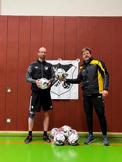 Thomas Kutsch (Deutsche Post DHL, re.) überreicht Fabian Kauffmann (Stellv. Vorsitzender TSV Niederweimar) die neuen Derbystar-Fußbälle.