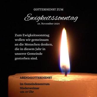 | 19.00 Uhr | Abendgottesdienst zum Ewigkeitssonntag in Niederweimar |