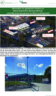 da die „Müllumladestation“ in der Siemensstraße 5 in Marburg-Wehrda zum „Entsorgungszentrum Marburg-Biedenkopf“ umgebaut wird, wird es ab dem 13. Dezember 2022 eine neue Einfahrt geben. Diese sehen Sie in dem Dokument beschrieben.