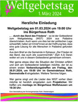 Gebet für den Frieden Jeden Montag, 18.30 Uhr, im Gemeindehaus Roth, Dammstraße 6