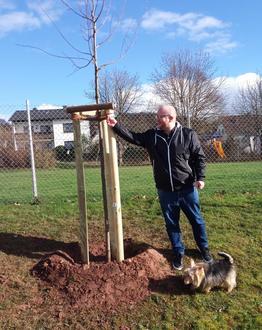 Patrick Bierau vom Ortsbeirat Wolfshausen schaut gespannt nach den neu gepflanzten Linden