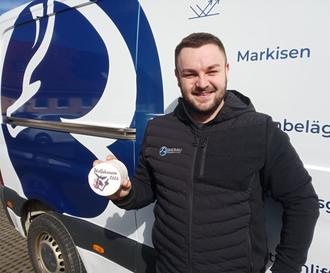 Stefan Bierau präsentiert den ersten eigenen Wolfshäuser Bierdeckel für das Jubiläumsjahr