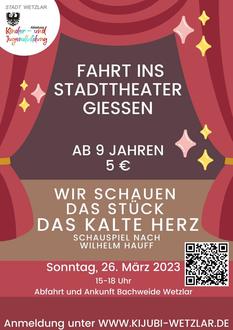 Das Jugendbildungswerk der Stadt Wetzlar lädt Kinder und Jugendliche ab 9 Jahren am Sonntag, 26. März, zu einem Besuch des Stadttheaters Gießen ein. Der Vorhang öffnet sich für das Stück „Das kalte Herz“, einem Schauspiel nach Wilhelm Hauff. Diese Veranstaltung wird durch das Aktionsprogramm „Aufholen nach Corona“ gefördert. Die Kosten für die Busfahrt und den Eintritt ins Theater belaufen sich auf 5 Euro. Abfahrt ist um 15 Uhr auf der Bachweide in Wetzlar.