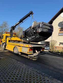 Nach Absicherung und Brandwache durch Fw Garbenheim Fahrzeug von Abschleppunternehmen aus Garten geborgen.