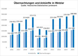 Nach den offiziellen Zahlen der Landesstatistikorganisation wurden in Wetzlar 288.980 Übernachtungen gezählt. Damit konnten die Wetzlarer Betriebe rund 3,3 Prozent mehr Übernachtungen als im Vorjahr aufweisen womit erneut einen Spitzenwert erreicht wurde.