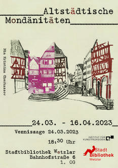 Zur Vernissage der Ausstellung „Altstädtische Mondänitäten“ von Nia Kristina Cherkassov lädt die Stadtbibliothek Wetzlar, Bahnhofstraße 6, am Freitag, 24. März, um 18.30 Uhr ins Obergeschoss ein. Es handelt sich um die Abschlussarbeit im Fachbereich Geschichts- und Kulturwissenschaften an der Justus-Liebig-Universität Gießen. Das künstlerische Projekt beschäftigt sich mit der Entwicklung der Wetzlarer Altstadt im Laufe des letzten Jahrhunderts bis in die Gegenwart. Dabei treffen unterschiedliche Medien zwischen historischer Fotografie, Druckgrafik und Zeichnung aufeinander, die in einer archivarischen Form ausgestellt werden. „Altstädtische Mondänitäten“ begibt sich zwischen Brühlsbachstraße, Domplatz und Langgasse auf die Suche nach einem persönlichen Neuzugang in das historisch gehaltvolle Zentrum der Stadt und dokumentiert die Besonderheiten alltäglicher Momente. Insbesondere der Fokus auf Architektur lädt dazu ein, sich dem stetigen Wandel von Stadträumen sowie der Dynamik von Vergänglichkeit und Erhaltung bewusst zu werden. Die Ausstellung ist bis zum 16. April zu besichtigen. Öffnungszeiten: Samstag und Sonntag: 10-15 Uhr, Dienstag, Mittwoch und Freitag: 12-18 Uhr, Donnerstag: 10-18 Uhr