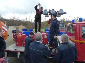 Das Flutlichtfahrzeug der Feuerwehr wird für die Verladung vorbereitet.