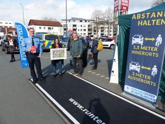Über das Thema Sicherheit für Radfahrer im Straßenverkehr informierten Vertreter der Polizei, der Stadtpolizei und des städtischen „Koordinationsbüros Mobilitätswende“ bei einem Infostand auf dem Rewe-Parkplatz im Wetzlarer Westend am Montag, 18. März. Im Mittelpunkt stand der vorgeschriebene, sichere Abstand, der beim Überholen von Radfahrern erforderlich ist: 1,5 Meter. Ein weiterer Infostand zu diesem Thema findet am Donnerstag, 18. April, von 10 bis 14 Uhr auf dem Wochenmarkt in der Bahnhofstraße (am Herkules Center) statt.