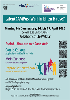 Die Volkshochschule Wetzlar lädt in der zweiten Osterferienwoche zum „TalentCampus“ ein, einem kostenlosen Ferienprogramm für Kinder und Jugendliche. Das Angebot ist vielfältig: Ob künstlerisches Gestalten mit Stein, Moosgummi und Playmais, Manga-Zeichnen oder Theater - der TalentCampus bietet unter dem Motto „Wo bin ich zu Hause?“ ein breites Spektrum an Workshops, die unter der Anleitung erfahrener Kursleitungen durchgeführt werden.