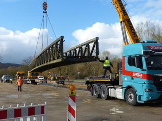 Die stark beschädigte Fußgänger- und Radfahrerbrücke über die Dill zwischen Bachweide und Bodenfeld in Wetzlar ist am Donnerstag, 26. März, im Auftrag der Stadt Wetzlar zur Reparatur in einer Spezialwerkstatt bei Papenburg verladen worden. Der 36 Meter lange, 3,10 Meter breite und 20 Tonnen schwere Stahlkoloss wurde mit einem Spezialkran ausgehoben und auf einem Tieflader verstaut. Wegen der Überlänge kann die Brücke nur nachts transportiert werden.