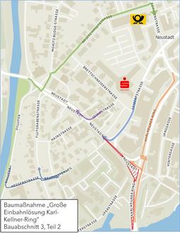 Im Rahmen der Straßenbaumaßnahmen am Karl-Kellner-Ring in Wetzlar beginnt am Donnerstag, 10. April, eine neuer Bauabschnitt, der einige kleine Änderungen in der Verkehrsführung im Bereich der Neustadt mit sich bringt: Ab Montag, 14. April, erfolgt die Deckensanierung auf der südlichen Seite der Neustadt bis zur Lahnbrücke im Karl-Kellner-Ring. Daher wird der von Dalheim (Altenberger Straße) kommende Verkehr auch weiterhin über die Waldschmidtstraße und Sophienstraße zum Karl-Kellner-Ring umgeleitet. Die Seibertstraße bleibt auch in diesem Bauabschnitt Einbahnstraße. Die Ausfahrt in Richtung Altenbergerstraße wird jedoch wieder geöffnet. Gleiches gilt für die Idingstraße. Aufgrund der Lage des Baufeldes steht im Bereich der Kreuzung „Neustadt“ stadtein- und stadtauswärts nur jeweils eine Fahrspur zur Verfügung. Da das Baufeld den südlichen Teil der Fahrbahn der Neustadt beinhaltet, kann die Zu- und Ausfahrt des Baumeisterweges (Zulassungsstelle, Seniorenzentrum) nur über die Straßen Dillufer und Flutgrabenstraße erfolgen. Das Ende dieser 3. Bauphase ist für den 5. Mai geplant.