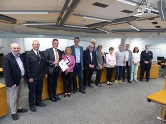v.l. Claus Spandau (Kommunales Beratungszentrum Hessen), Feuerwehrleiter Erwin Strunk, OB Manfred Wagner, Regierungsdirektorin Andrea Speier, Bürgermeister Frank Inderthal (Solms) sowie weitere Vertreter der beteiligten Kommunen (Foto: Stadt Wetzlar)