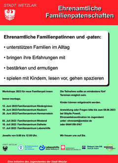 Zur Unterstützung von jungen Familien sucht die Abteilung Frühe Hilfen des Jugendamtes der Stadt Wetzlar Menschen, die als Familienpaten tätig werden möchten. Familienpaten nehmen sich Zeit, spielen mit Kindern oder gehen zusammen spazieren, hören zu, ermutigen, geben Tipps und Hilfestellung. Sie engagieren sich ehrenamtlich und können die Brücke zu anderen Angeboten bilden. Auf die Tätigkeit werden sie in sechs Treffen vorbereitet und lernen dabei die beteiligten Institutionen näher kennen, die sie auch bei Ihrer späteren Arbeit begleiten. Die Workshops finden von Montag, 12. Juni, bis Montag, 17. Juli 2023 jeweils wöchentlich montags von 9 bis 12 Uhr statt und sollten möglichst verbindlich wahrgenommen werden können. Kooperationspartner sind: Frühe Hilfen Stadt Wetzlar, Freiwilligenzentrum Mittelhessen, Caritasverband Wetzlar/Lahn-Dill-Eder, Kinderschutzbund Kreisverband Lahn-Dill/Wetzlar, Diakonie Lahn Dill, Lebenshilfe Wetzlar-Weilburg.
