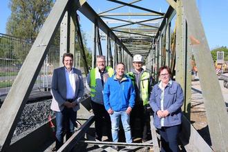 Ein letztes Mal auf dem "Alten Lahnsteg": v.l. Bürgermeister Andreas Viertelhausen (FW) mit Mitarbeitern des Tiefbauamtes der Stadt Wetzlar, der Baufirma Albert Weil und der Naunheimer Ortsvorsteherin Andrea Volk (SPD).