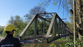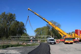 Der Brückenaushub der 32 Tonnen schweren Konstruktion erfolgte mit einem 45 Meter langen Autokran, der eine über eine maximale Traglast von 50 Tonnen verfügt. Zuvor waren noch Schweißerarbeiten vonnöten, um die Enden der Brücke an den Ufern zu lösen. Anschließend wurde die Brücke binnen weniger Minuten ausgehoben und sicher auf dem Festplatz abgestellt.